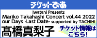 全国ラストコンサートツアー2022「our Days」開催予定のお知らせ2020年に予定しておりました全国コンサートツアー Iwatani Presents Mariko Takahashi Concert vol.44「our Days」supported by TACHIHIは、 新型コロナ感染拡大の影響で2021年の振替公演を含め、全公演中止となりました。 (チケットの払い戻しは、2021年4月25日をもって終了しております) 改めまして、全国ラスト・ツアー「our Days」として 2022年1月下旬から同規模以上の開催を予定しております。 新たなツアースケジュールは、2021年8月上旬にconcertのページにてご案内いたします。 公演を楽しみにお待ち頂いていたお客様には大変申し訳ございませんが、 もうしばらくお待ち頂けますようお願い申し上げます。 皆様のご理解とご協力を賜りますようお願い申し上げます。 2021年4月26日 株式会社ザ・ミュージックス |